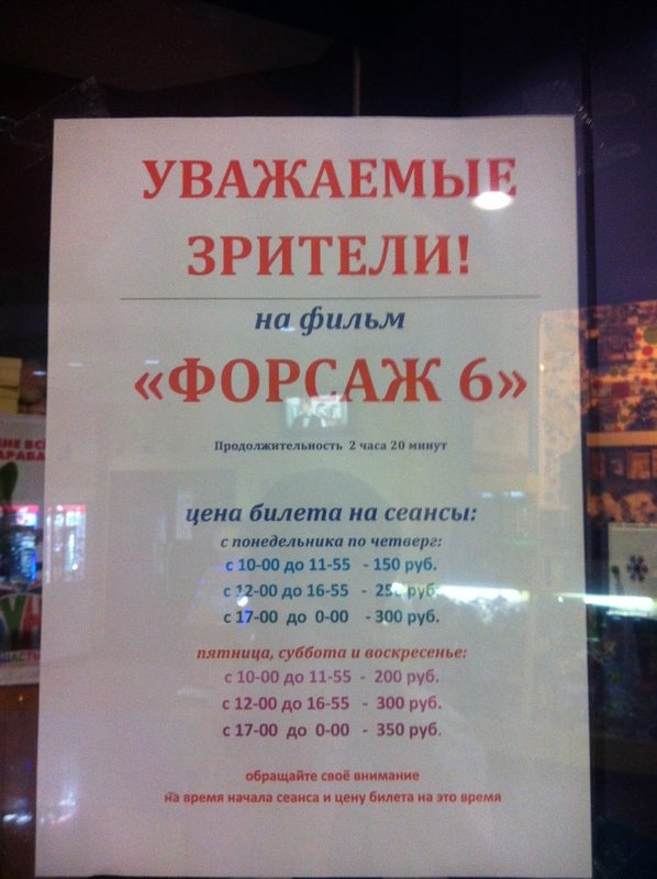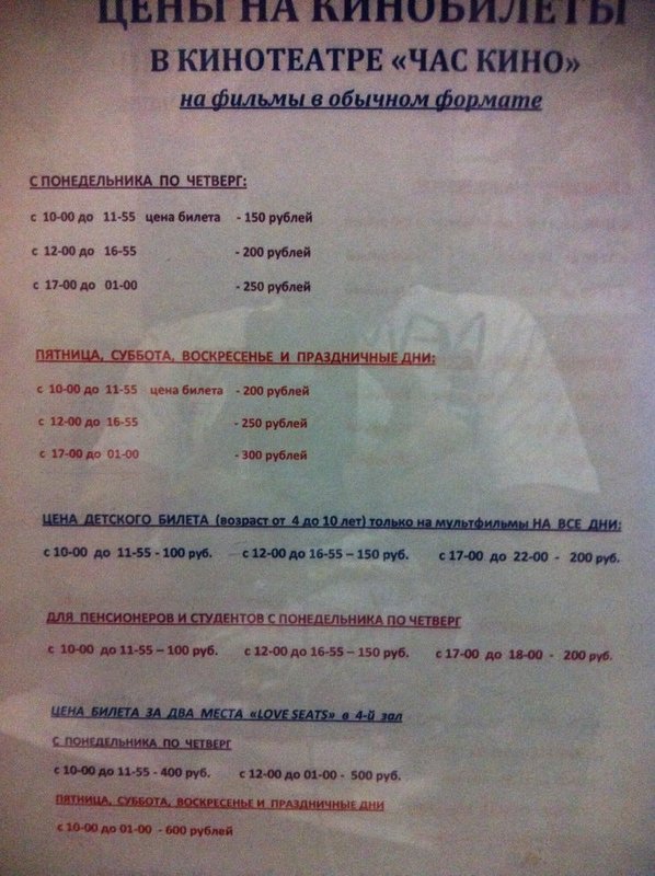 Пн-пт: 12:00—21:00; сб-вс: 11:30—21:00; до последнего сеанса